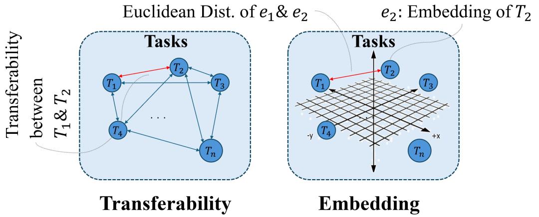 - 与迁移性对齐:嵌入之间的距离反映任务间关系