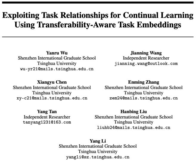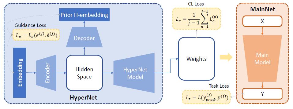 其核心思想是:在每次学习新任务前,通过信息论度量构建可迁移性感知的任务嵌入H-embedding,并利用超网络根据嵌生成任务专属参数,从而显式地在CL过程中编码任务关系。