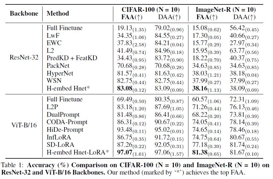 H-embedding引导的超网络框架在多个基准上取得领先表现,展示了任务关系建模在持续学习中的关键作用。