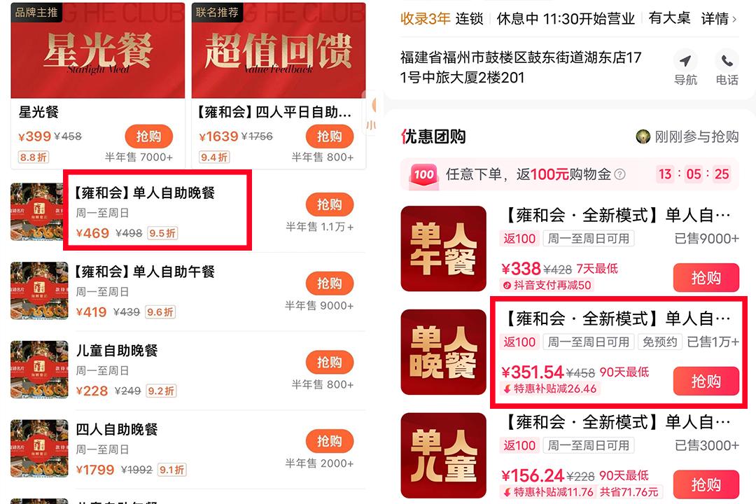 但高价仅仅维持了几个月,今年年初,品牌就悄悄将价格降回了400元区间价位。11月中旬,雍和会福州湖东路店再次进行了闭店升级,店铺更名为“雍福·海鲜姿造自助”,单人价格更是直接降百元,调整为了午餐358元/位、晚餐388元/位,且增加了包含每桌100元押金,用餐超时每20分钟,按30元/人收取在内等等多条用餐规则。