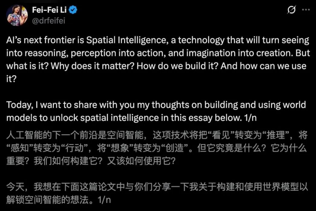 持有相同观点的还有知名华人科学家李飞飞。李飞飞认为人工智能下一个十年的主要技术方向,应该是具备空间智能的“世界模型”。而判断是否具备“空间智能”的标准是:能够生成符合物理定律且空间一致的世界,处理从图像到动作的多模态输入,并预测这些世界将如何演变或与它们互动。