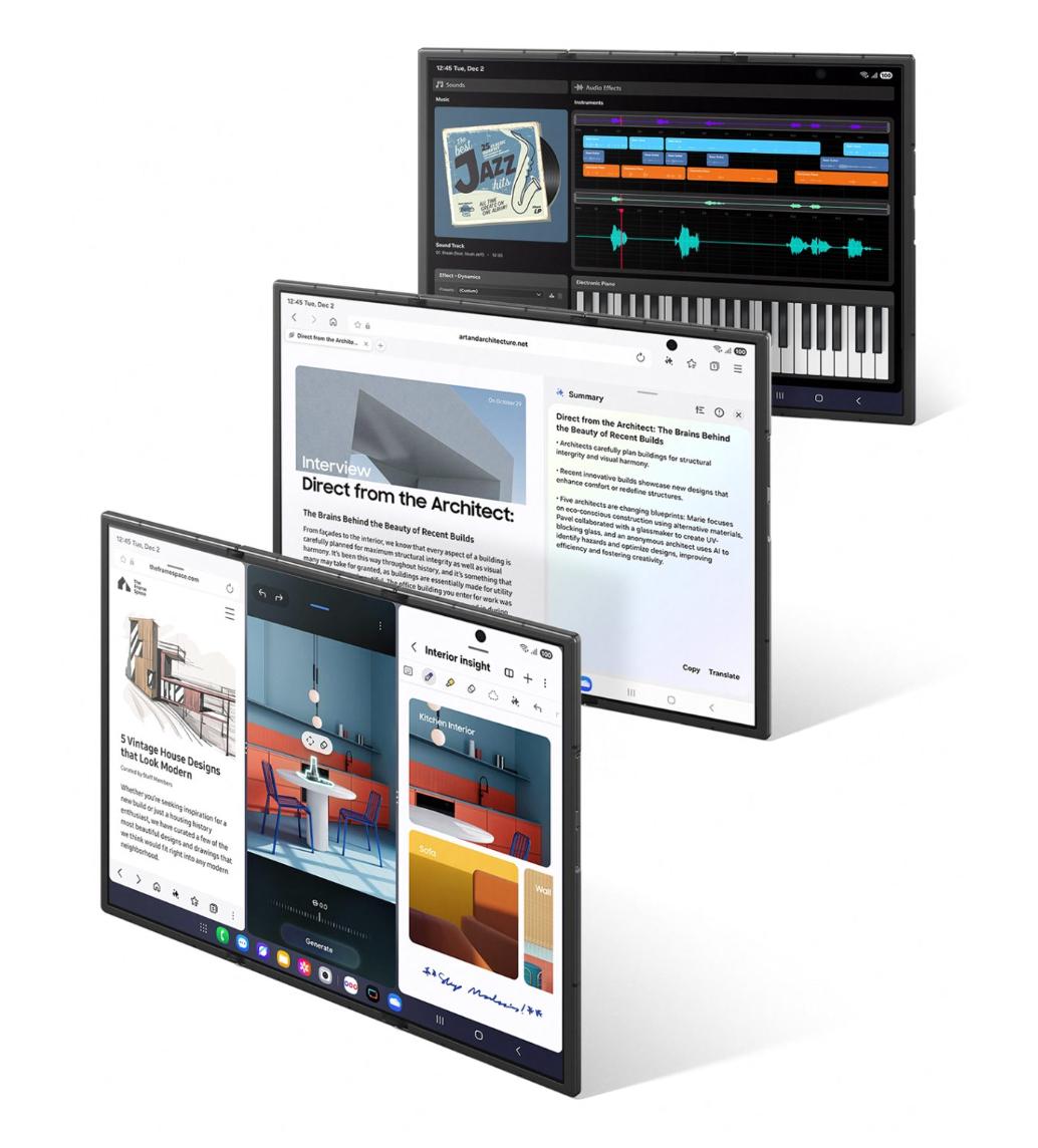 在操作方面,当Galaxy Z TriFold打开成10英寸显示屏时,可以为用户呈现类似于三部6.5英寸智能手机的效果,提供多任务处理空间。