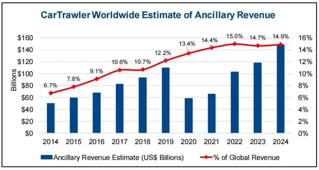 是因为包括行李和选座在内的【辅营收入】正在对航司们越来越重要。麦肯锡统计显示,行李服务和选座服务贡献了超过50%的辅营收入。而根据CarTrawler的最新报告,2024年全球航空公司辅营收入将升至1484亿美元,在全球航空公司中占比14.8%,远超2023年的1179亿美元。