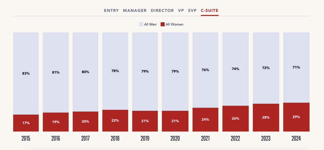 近十年来美国企业核心高管层的男女性别比例(资料来源:“向前一步”基金会)