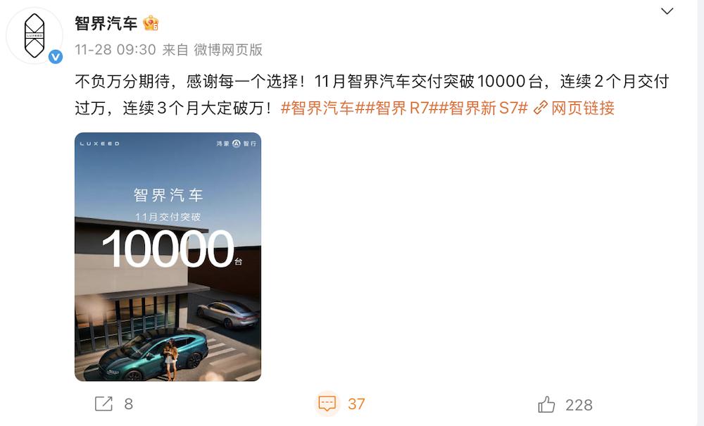 智界品牌更是在11月还没结束时就直接官宣当月交付量超过1万台。享界品牌也在11月推出了改款享界S9,加码冲击传统豪华轿车市场。