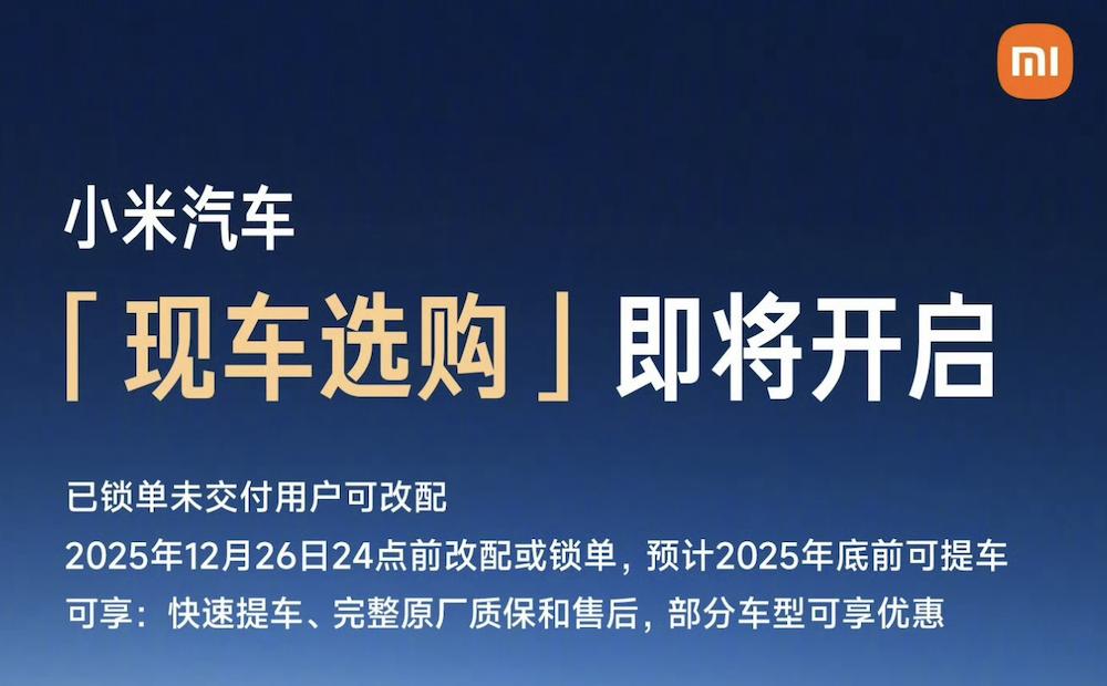 与此相对应的是,小米汽车今天还甩出了一项现车选购政策,为已经锁单但未交付的用户,优先改配同类型现车(全新现车、官方展车、准新车),用户可享受完整原厂质保和售后、跨年购置税补贴,有望将订单加速转化为交付量。