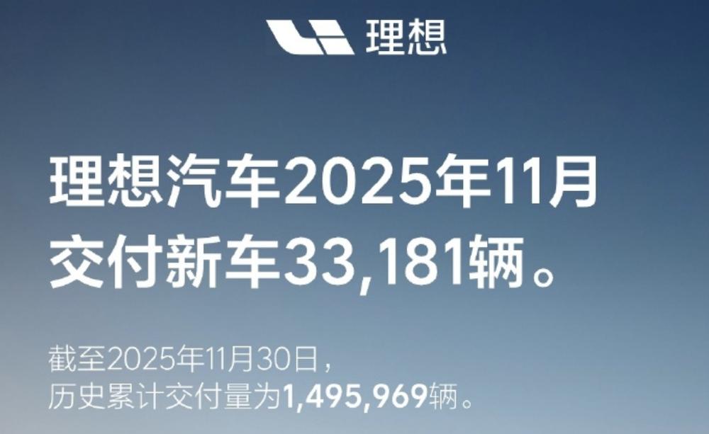 理想汽车2025年11月交付3.32万辆,同比减少32%,环比增长4%。