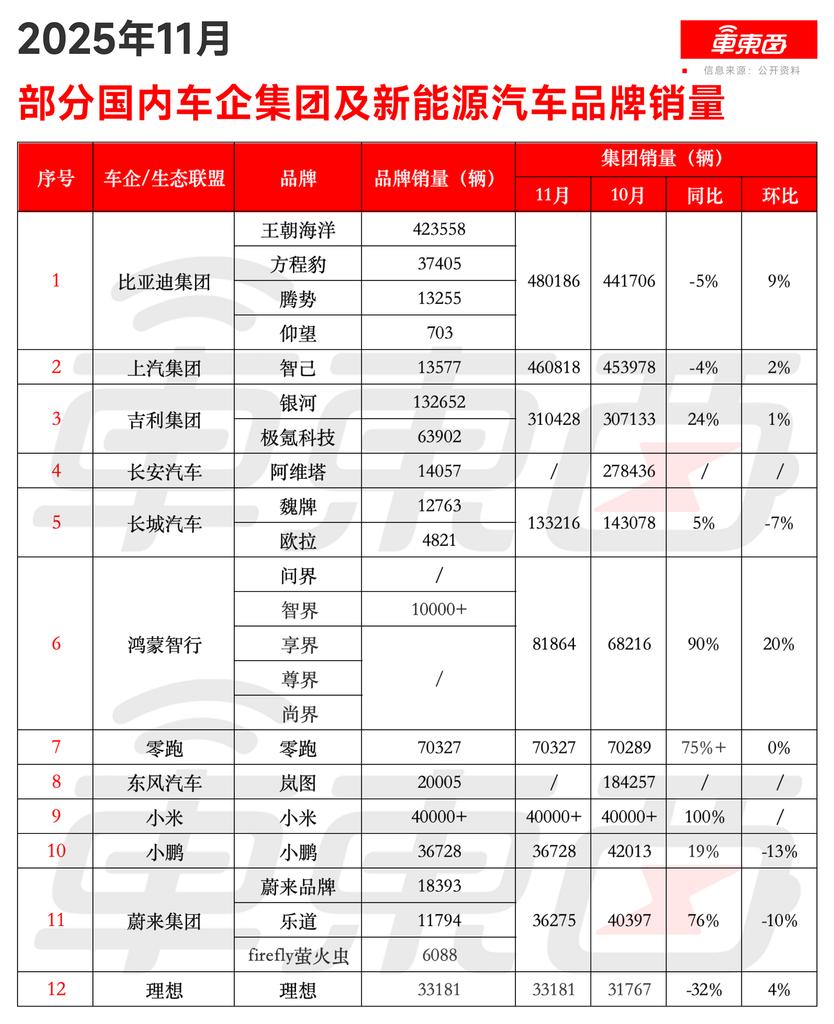 ▲2025年11月部分国内车企集团及新能源汽车品牌销量