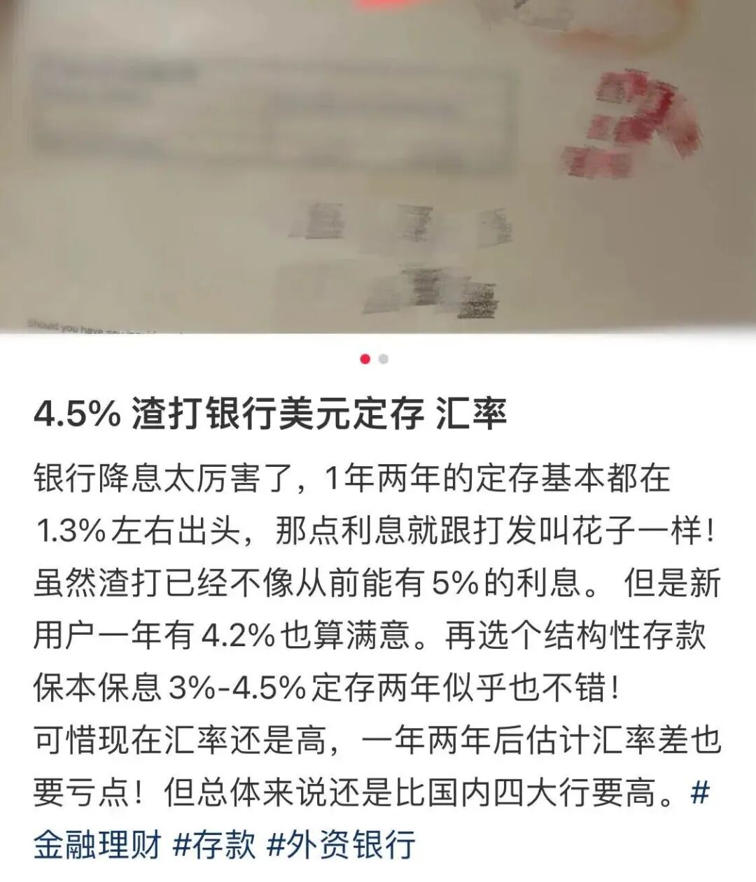 颖姐打算以全部积蓄39万,撬动一个“通过储蓄让资产升值”的机会。来自小红书的“显著利率差距”让她盘算,把钱换成美元存到境外账户,就能拿到更可观的利息回报。