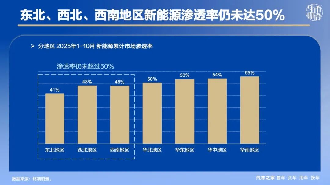 分地区来看,并非所有的细分市场的新能源渗透率都实现了50%的跨越。东北、西北和西南地区依旧是燃油车主导。至2025年1-10月,新能源渗透率均未超过50%,特别东北地区渗透率最低,为41%。