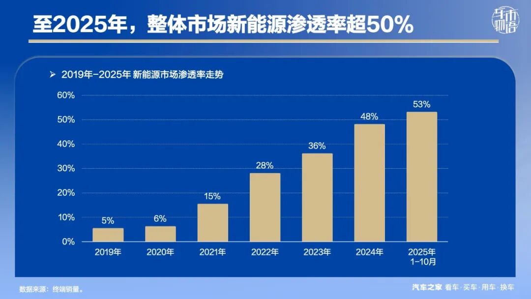 至2025年1-10月,新能源市场首次突破50%大关,但增长速度也开始放缓,同比2024年1-10月仅增长6个百分点。