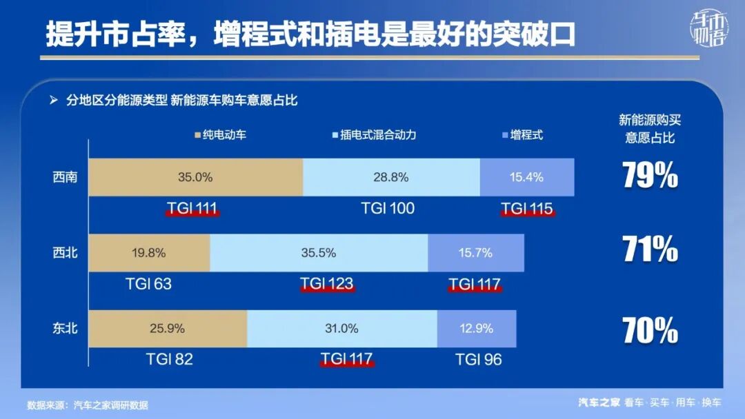西南、西北和东北地区的购车意向用户真的不想买新能源车吗?并非如此。据汽车之家调研数据显示,三个地区新能源车购买意愿占比均超过70%,其中西南地区最高,接近80%,都远超该地区当前的新能源市占率。
