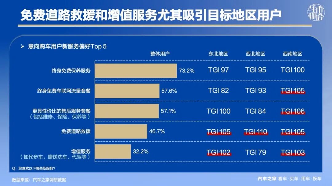 其中,西南地区用户对新服务接受度相对更高,除了免费保养外,对其他四项新服务都更为关注。