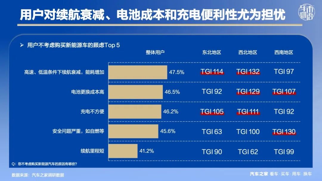 但仅仅是这些显然不够,对这些地区用户而言,他们拒绝购买新能源车的主要原因不在于“福利”不够多,而是顾虑太重。