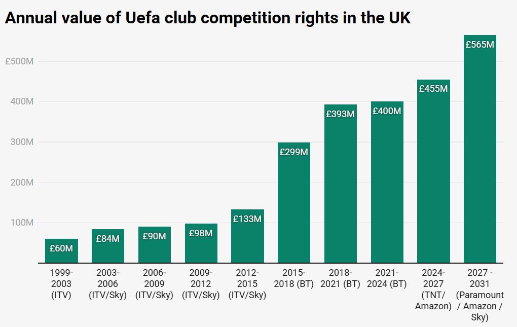 欧足联俱乐部赛事英国版权年均价值变 化图源:SportsPro