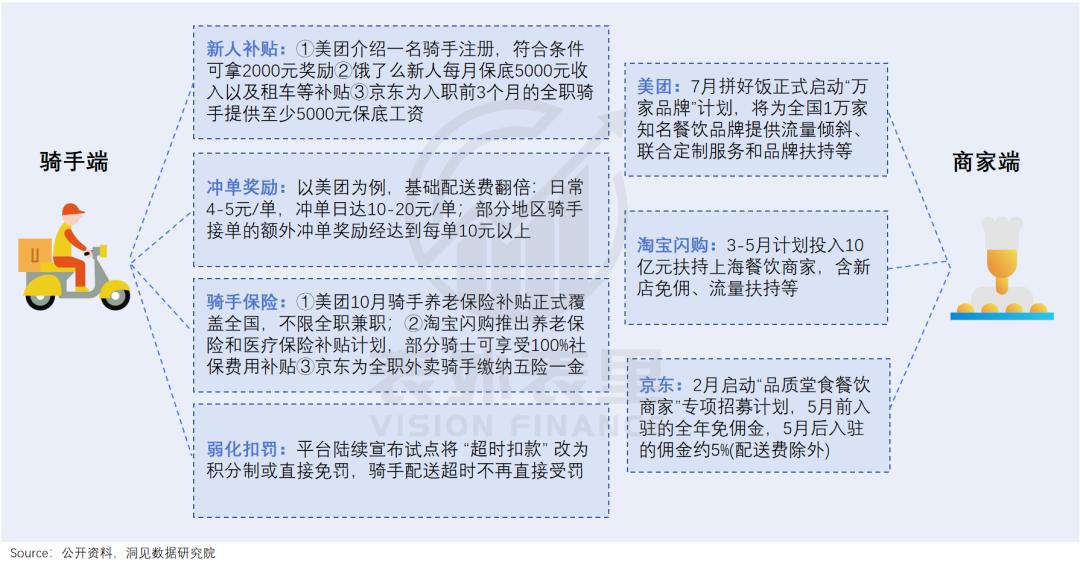 基于此,各家不仅争夺用户,也不约而同在运力侧、供给侧发起了全面竞争,通过发补贴、买社保等福利吸引骑手,通过降佣金、给流量扶持商家。