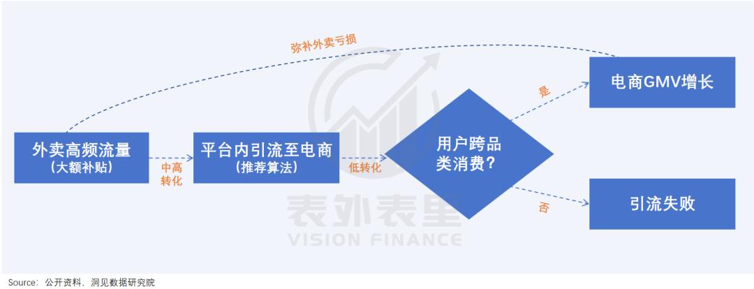外卖与电商协同,有赖于“补贴吸引用户→站内引流至电商→培养用户电商消费习惯→跨品类消费”的长链条,其中任一环节都可能带来用户流失。