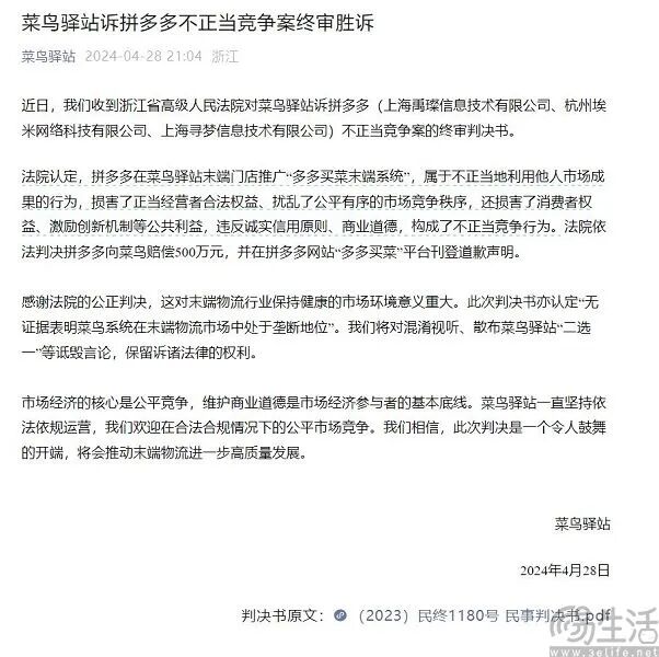同时从中通兔喜、极兔邻里、圆通妈妈驿站,到韵达超市、申通喵站就不难发现,末端网点作为直接触达用户的入口和利润结构中的关键环节,已成为了几乎所有快递企业激烈争夺的焦点。这就意味着菜鸟驿站包裹量将被持续分流,从而进一步加剧驿站的盈利压力。此前在多多买菜不正当竞争案的判决书中也显示,“无证据表明菜鸟驿站在末端物流市场中处于垄断地位”。