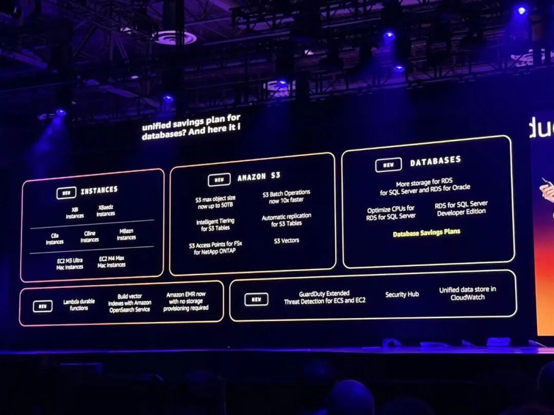 存储方面,包括将S3最大对象大小从5TB提高到50TB,增加10倍;亚马逊S3的数据管理功能S3 Batch Operations更新,在200亿个对象的规模下,完成作业的速度提升10倍;为S3 Tables提供智能分层,节省80%存储成本;S3 Tables支持AWS区域和账户间自动复制;扩展Amazon S3接入点,支持Amazon FSx for NetApp ONTAP;用于存储和查询向量的对象存储S3 Vectors全面上市;利用GPU提升向量索引构建效率,速度提升10倍,仅需1/4成本。