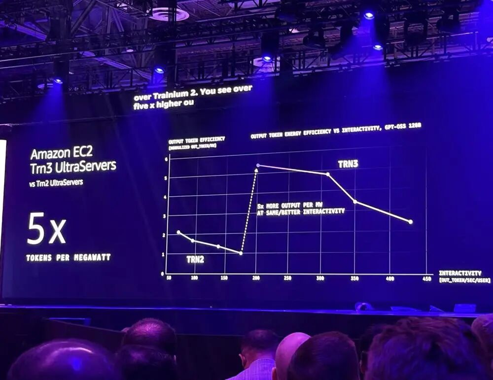 值得注意的是,Amazon EC2 Trn3 UltraSevers在能效比上也有提升,每兆瓦所处理的token数量达前代产品的5倍。