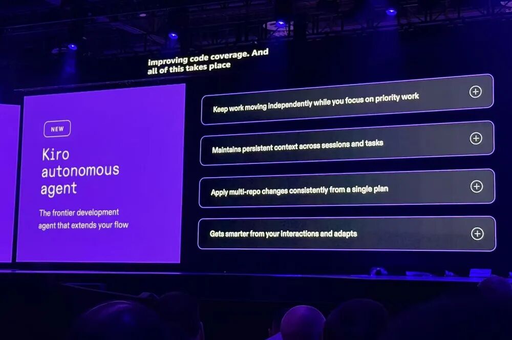今年早些时候,亚马逊云科技发布了面向专业开发者的AI IDE “Kiro”。加曼称,已经有数十万开发者在使用Kiro,有开发者感叹,用了Kiro之后,自己在过去5个月内交付的代码,比过去10年还要多。上周,亚马逊已经把Kiro定为该公司的官方AI开发环境。