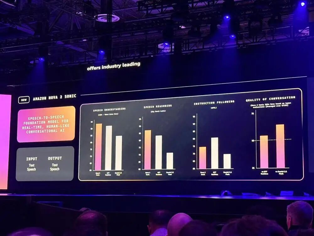 Nova 2 Sonic则是亚马逊云科技的下一代语音转语音模型,支持文本和语音两个模态的输入输出,能为AI应用提供实时、类人的对话式AI体验。在语音理解和推理任务上,其性能已经超过了GPT Realtime、Gemini 2.5 Flash等。