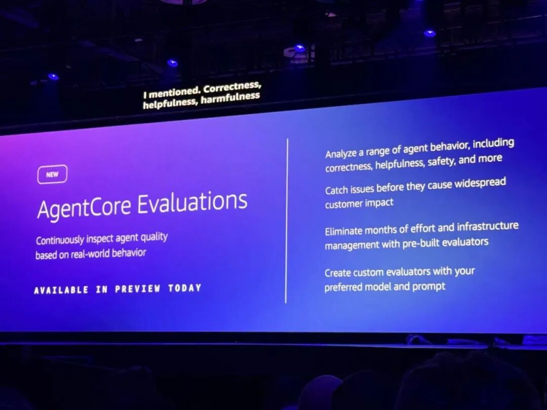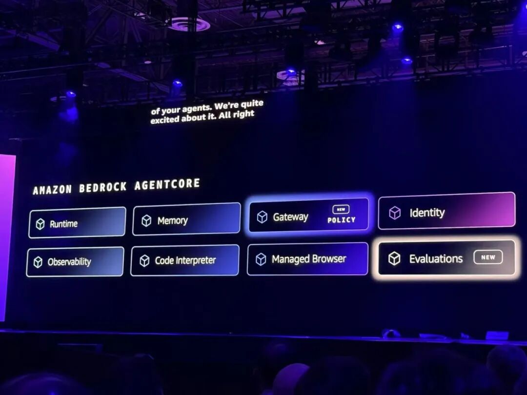 8、AgentCore开发工具:Policy in AgentCore(预览版),使用细粒度权限策略,给agent行动设置明确边界;AgentCore Evaluations(预览版),使用评估器,根据现实世界行为来持续检查agent质量。