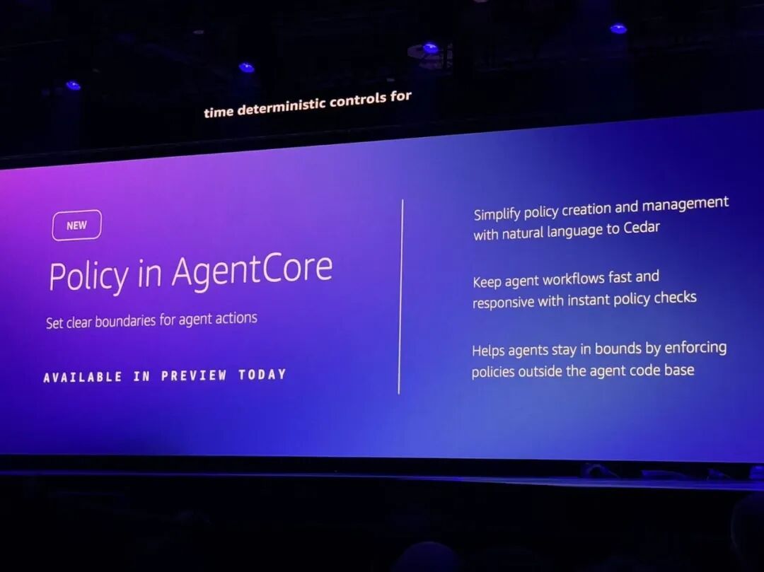 Policy in AgentCore允许开发者在AgentCore Gateway工具调用运行前拦截,使用带有细粒度权限的策略,为Agent行为定义明确的界限,如使用哪些工具、如何使用工具,开发者也可以通过自然语言创建标准,如“报销金额大于1000美元时,就阻止退款”等。