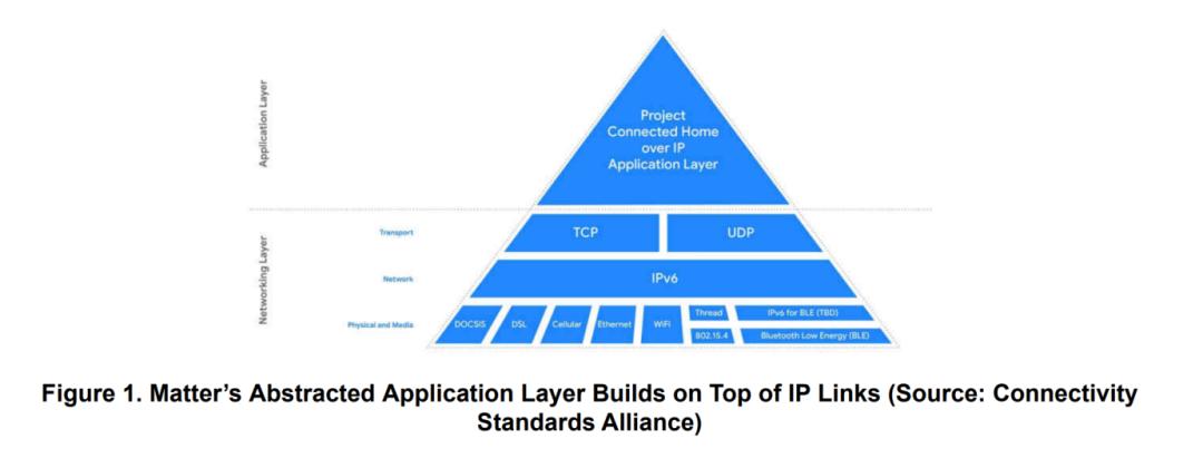 Matter提供了抽象化的应用层,构建于Wi-Fi、以太网和Thread等IP协议之上。这一基于 IP协议的统一应用层,既提升了消费端设备的互操作性,也为解决方案提供商简化了跨连接协议与技术的开发流程。