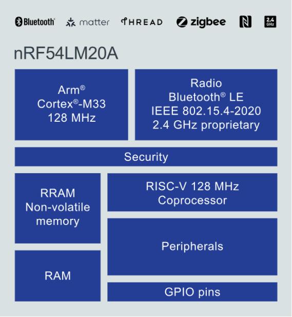 今年9月,Nordic Semiconductor扩展nRF54L系列产品线,推出专为先进低功耗蓝牙和Matter应用而设计的高内存无线SoC nRF54LM20A。nRF54L系列基于Nordic创新的22nm技术平台,配备2 MB NVM和512KB RAM,同时保持相同的MCU功能,带有128 MHz Arm Cortex-M33处理器和RISC-V协处理器,并通过高速USB接口和多达66个通用输入输出端口增强了全面的外设配置。该产品还集成了Nordic第四代超低功耗2.4 GHz无线电,支持低功耗蓝牙、信道侦听、Matter over Thread协议等。
