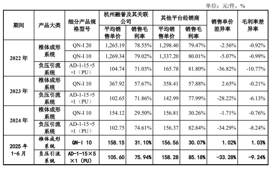 平均售价方面,2022年—2024年及2025年上半年,杭州融誉负压引流系统的平均售价分别为104.74元/件、102.65元/件、102.75元/件和105.6元/件,同期其他平台经销商的平均售价分别为165.78元/件、142.99元/件、156.37元/件和158.28元/件,均低于其他平台经销商,且双方销售的均是同一型号产品,差异率在28.22%—36.82%之间。