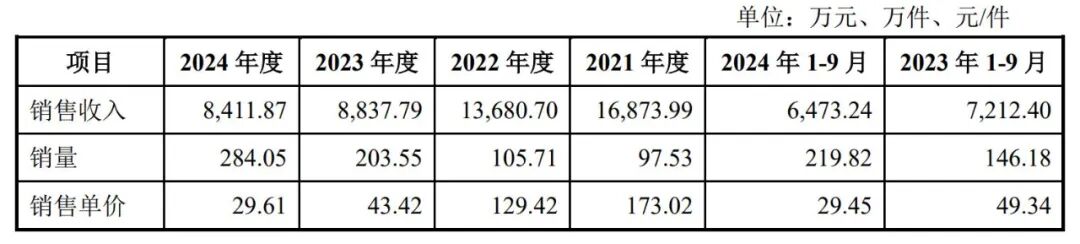 在对北交所的《回复函》中,爱得科技表示,脊柱类产品近年来收入下降主要受集采政策执行的影响,产品销售单价出现明显下滑,从2022年的129.42元/件降至2024年的29.61元/件,降幅达77.12%。不过集采后实现了“以量补价”,脊柱类产品的年销量从2022年的105.71万件涨至2024年的284.05万件,提升近两倍。