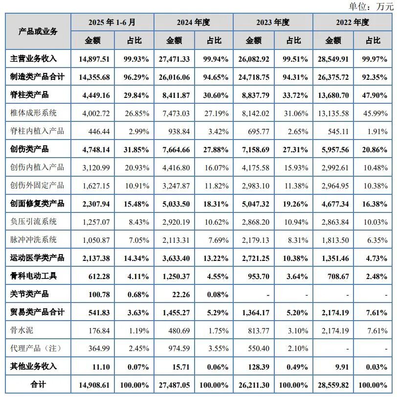 2025年上半年,爱得科技脊柱类产品的收入和营收占比进一步下降,分别降至0.44亿元和29.84%。
