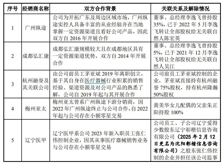 比如前员工茅亚斌2019年离职后创立了杭州融誉及其关联公司(下称“杭州融誉”),2022年—2024年及2025年上半年,杭州融誉均是爱得科技的第二大客户,占后者营收的7%左右,主要销售椎体成形系统、负压引流系统等,是爱得科技覆盖浙江、上海地区的平台经销商。目前茅亚斌直接持有杭州融誉75%的股权。