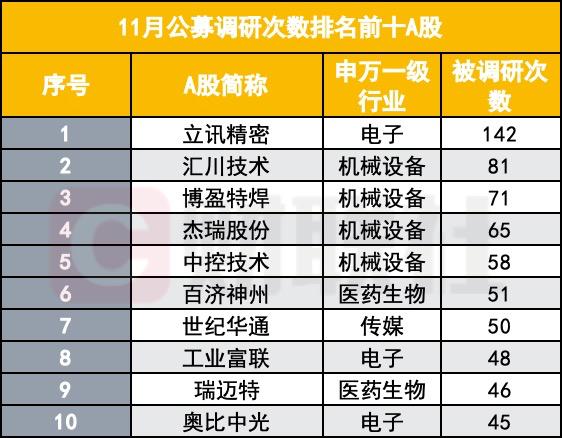 机械设备行业则以819次调研紧随其后,覆盖71只个股。该行业内,汇川技术、博盈特焊、杰瑞股份和中控技术四家公司同时进入11月公募调研次数前十榜单,分别被调研81次、71次、65次和58次。调研内容聚焦点各异,如汇川技术的自动化业务增长弹性、博盈特焊在垃圾焚烧市场的份额扩张及海外二期工厂进展、杰瑞股份在天然气设备上的技术优势和中控技术“AI+工业”融合落地。