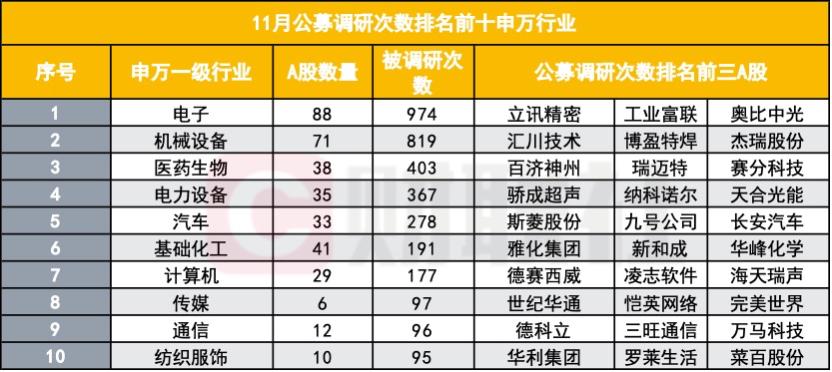 从行业分布来看,11月公募调研活动呈现出明显的聚焦效应。电子行业以974次调研居于首位,调研覆盖88只个股,行业内最受关注的是立讯精密、工业富联和奥比中光。三家公司不仅均位列调研频次前十,其中立讯精密更是被调研142次,成为11月“最受宠”个股。机构对其三季度经营情况展开密集沟通,背后正是对其核心连接器业务与消费电子链条前瞻变化的关注。