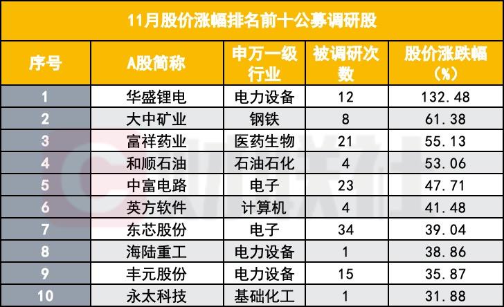 其中,华盛锂电以132.48%的单月涨幅拔得头筹,成为11月涨幅最大的调研标的。该公司所属的电力设备行业也在本月强势表现,入围涨幅前十的还有海陆重工与丰元股份。另一条涨幅与调研高频重合的主线是电子行业,中富电路与东芯股份均涨幅居前,同时分别被调研23次与34次,在高频调研榜单上也赫然在列。以此为线索,调研方向与股价表现的交叉点,或已勾勒出聪明钱正在关注的两大主线。