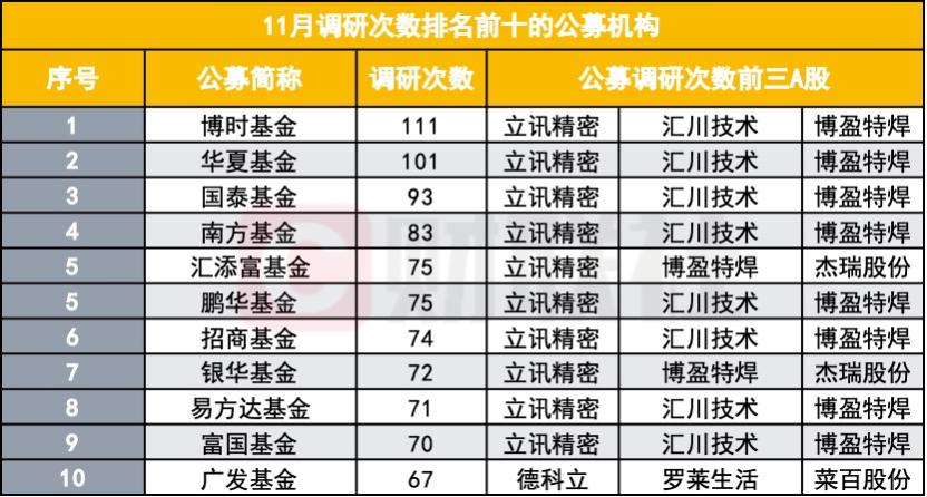 在活跃度方面,11月共有85家公募基金调研次数不低于20次,其中25家机构调研超过50次,头部基金公司调研意愿依旧旺盛。博时基金以111次居首,紧随其后的是华夏基金(101次)和国泰基金(93次),南方基金、汇添富基金、鹏华基金等也均进入调研前十阵营,调研次数集中在67至83次之间。