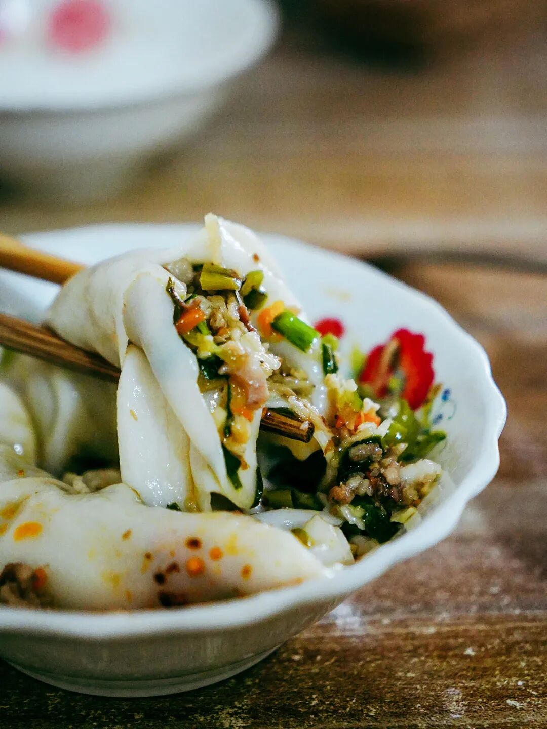 除了宴席上的大菜,本地老饕更钟情于街头巷尾的朴实滋味。扁肉,这个在《闽杂记》中被清人施鸿保特意与馄饨区分的小吃,在这里呈现出两种性格:香炸的扁肉金黄脆口,汤煮的则在酸辣汤中舒展,配以紫菜和猪油渣,风味各有千秋,是许多当地人一天的开始。