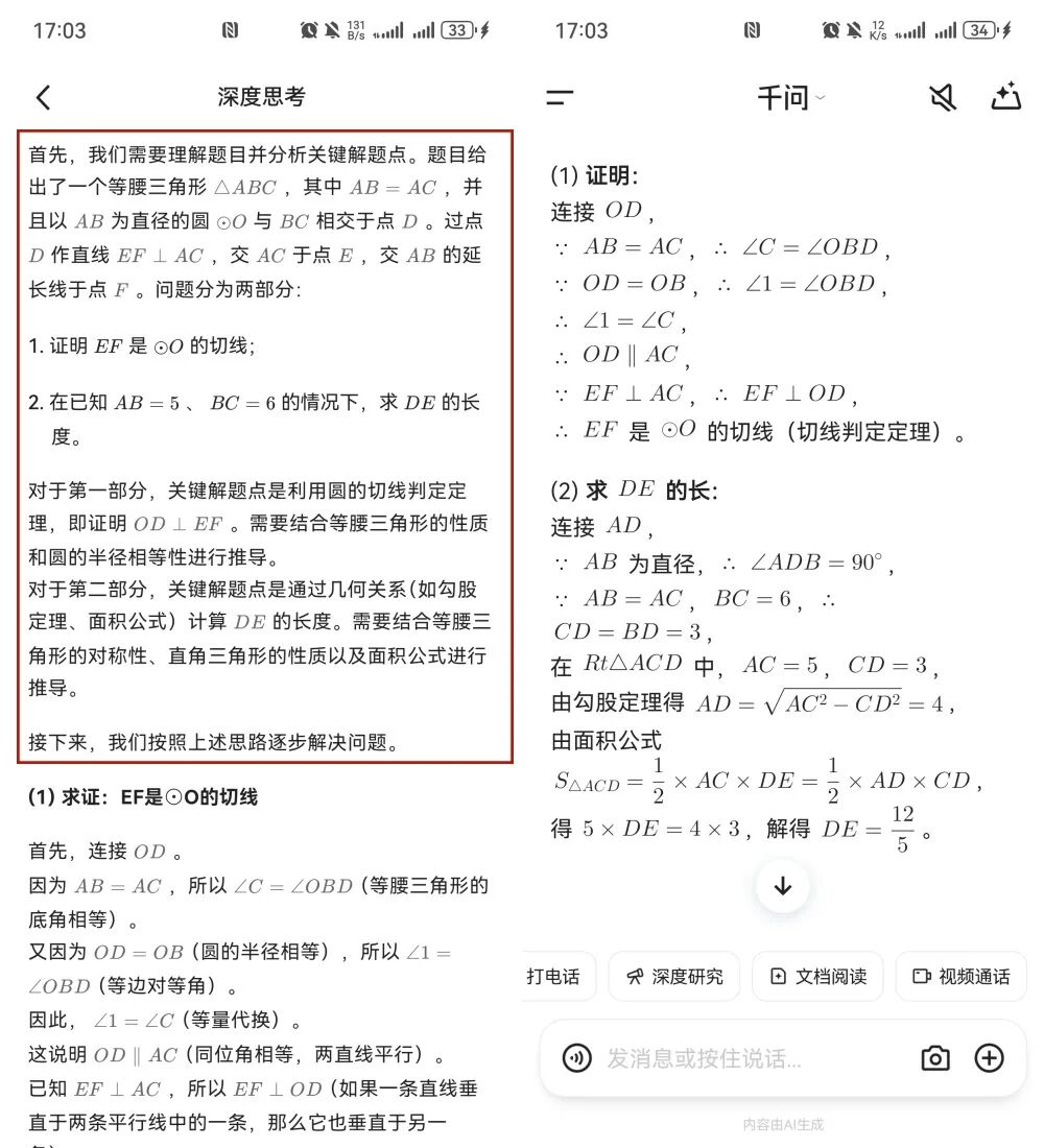 可以看到,千问给出的答案正确,解题过程清晰明了,不仅写清了是什么,还解释透了为什么。其生成的解题过程,使用的∵(因为)∴(所以)⊥(垂直)等数学符号,以及答题格式均符合规范。