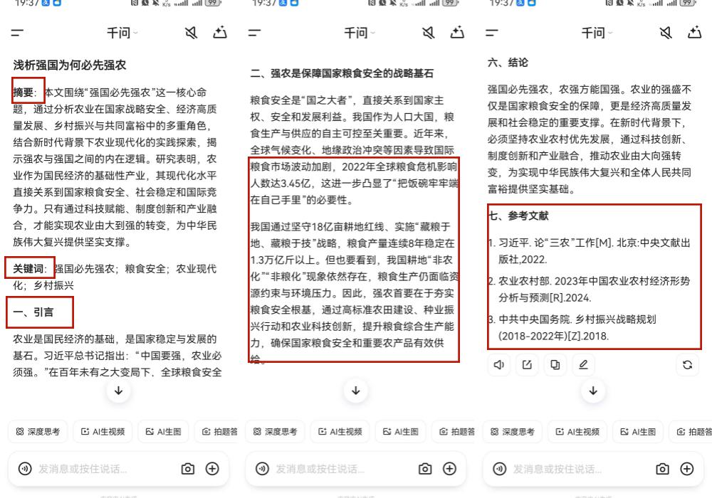 千问所输出的论文,不仅摘要、关键词、引言、结论、参考文献等论文格式正确,还在文章中引用了数据作为论据支撑,且参考文献的引用格式也是准确的,整篇文章几乎可以“拿来就用”。