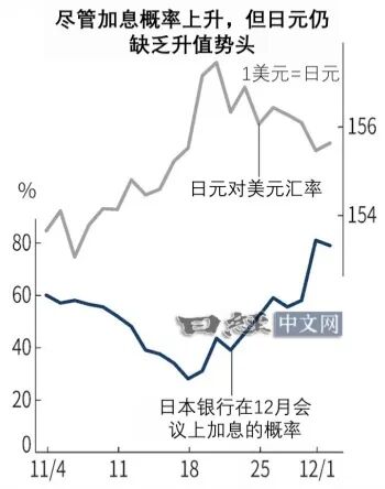 尽管如此,日元汇率却反应迟钝。11月18日的加息概率为近期最低的28%,当天的汇率在1美元兑155日元关口附近,而12月2日的汇率为1美元兑155.5日元至155.9日元,日元反而进一步走弱。