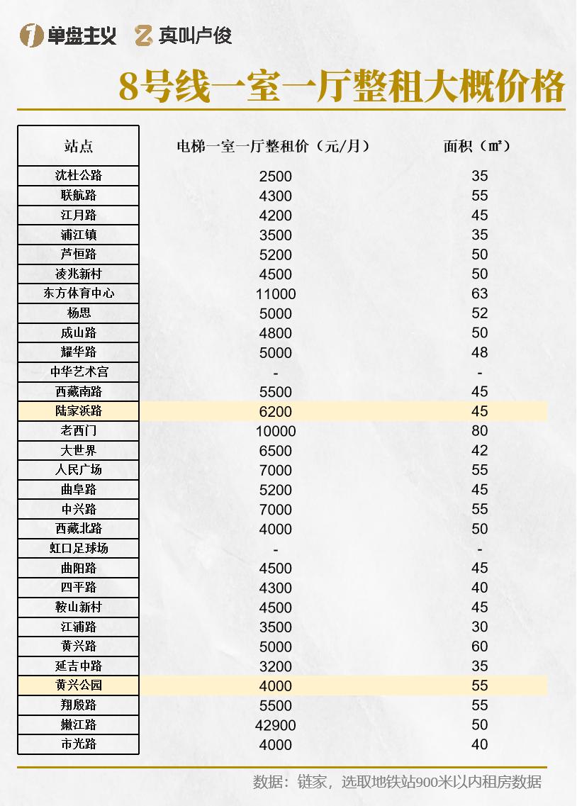 整理了一下8号线一室一厅整租带电梯的价格,会发现,首末站的价格确实便宜一些,但是并不一定是性价比最高的。沈杜公路上车没有座位就得站到陆家浜路,较远;下班从市中心出发就得做好站到终点的准备,车厢比较小的情况,舒适度也大打折扣。再从下车后的周边感知,有商家,但基本都是“生活体征维持”程度的商业。这一站要到附近的商圈比如浦江城市生活广场、红星国际广场基本都在1.5km以上。同时也没什么新房,暂时只有在建的象屿·天宸雅颂,距离地铁站也很近,一条城市主干道的距离。其余的住房房龄都较老,有电梯的也很少。在这样的情况下,其实再往里走几站,比如联航路、浦江镇,综合性价比可能都会更高。