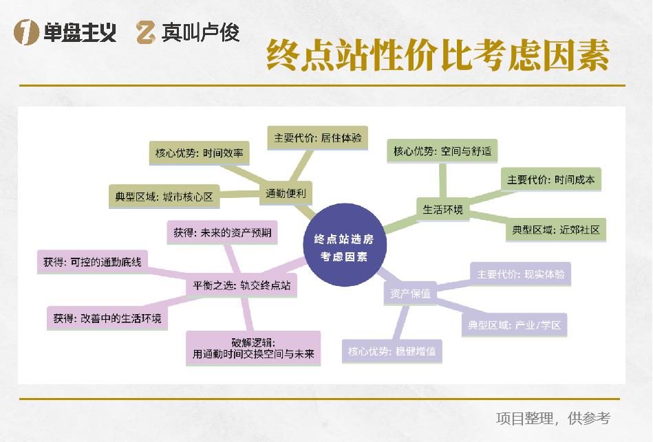 最后,还有一个针对置业的确定性投资。交通便利的地方今天可能是一个单纯的站点,但是有空地和开发弹性的终点站很有可能成为一个小型的中心。随后的教育、医疗资源也可能发展完善。其房产在二手市场的变现能力和抗跌性,大概率远胜于一个孤立的、缺乏规划的“孤岛”楼盘。