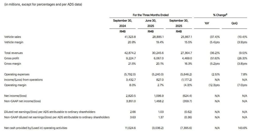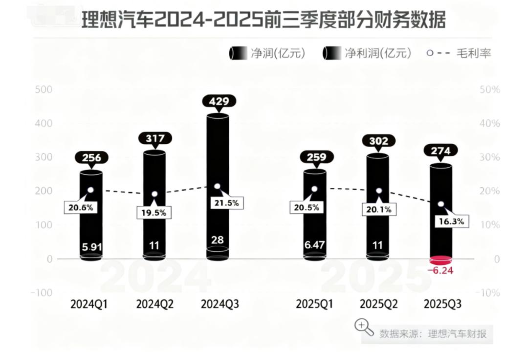 财务表现亮起红灯,根据理想汽车2025年第三季度财报显示,公司当期营收为274亿元人民币,同比大幅下降36.2%。更引人瞩目的是,该公司净亏损6.24亿元,这终结了其此前连续11个季度的盈利纪录,在市场与投资者中引发了广泛担忧。