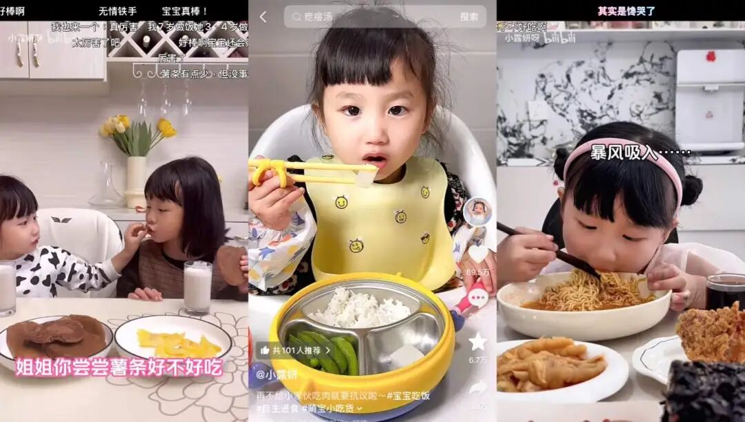 同期走红的“老款小孩”不在少数,这一赛道上最常见的内容就是小孩吃播。