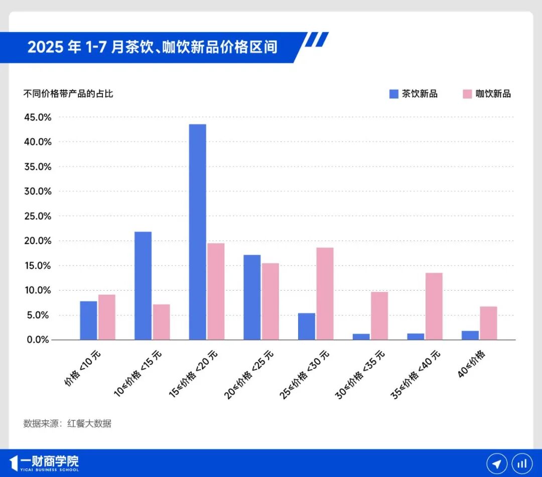 不过茶饮品牌很清晰地意识到,自己的产品应该卖多少钱。同样在2025年1-7月,82.4%的茶饮新品处在10-25元的区间里,形成了茶饮的“黄金价格带”。行业虽然拥挤不堪,但互相竞争的茶饮品牌早就形成了共识,卷也要卷在固定区间里。