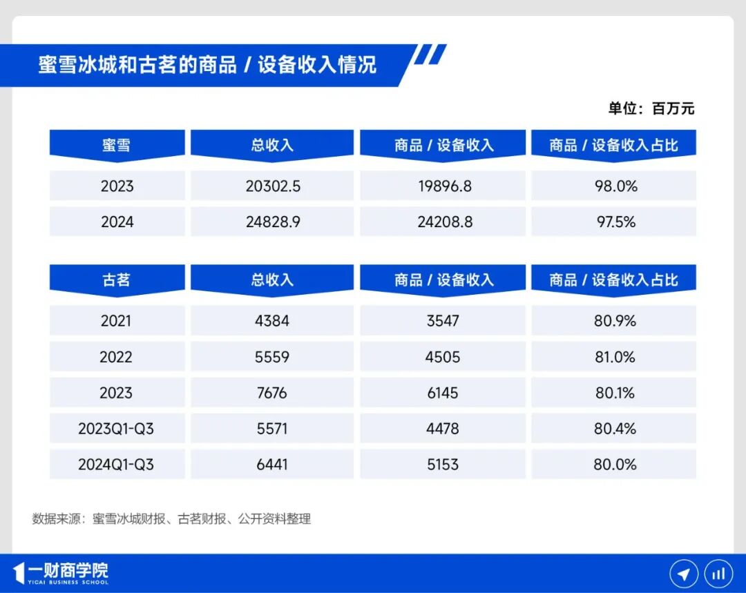 从模式来看,头部茶饮公司大多选择做个合格的供应商。财报显示,目前蜜雪冰城、古茗这两家门店数量第一、第二的头部茶饮公司,有95%和80%以上营收来自向加盟商销售商品和设备。商品和设备的销售毛利率也在30%和18%左右。