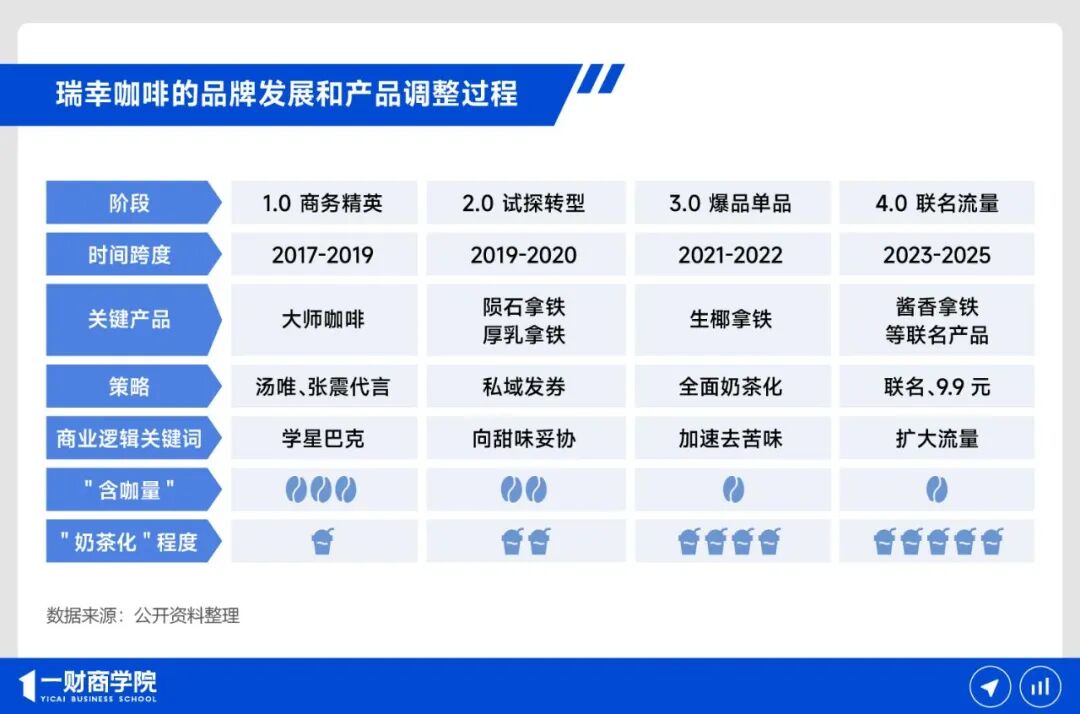 从1.0时期试图通过有品位的代言人教育咖啡消费者,到2.0和3.0时期用陨石拿铁、生椰拿铁里的糖分讨好大众消费者,再到后来同时在味觉和流量上发力。