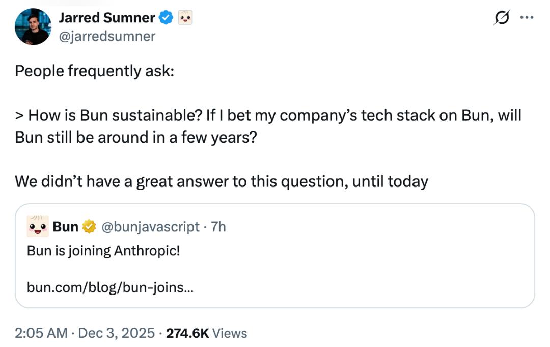 “Bun 恰恰代表了我们希望引入 Anthropic 的那种卓越技术。Jarred 和团队从第一性原理出发,重新思考了整个 JavaScript 工具链,同时始终关注真实场景。”Anthropic 首席产品官 Mike Krieger 表示,“把 Bun 团队引入 Anthropic,将让我们构建出能够持续放大这种增长势能的基础设施,并跟上 AI 应用指数级扩张的节奏。”